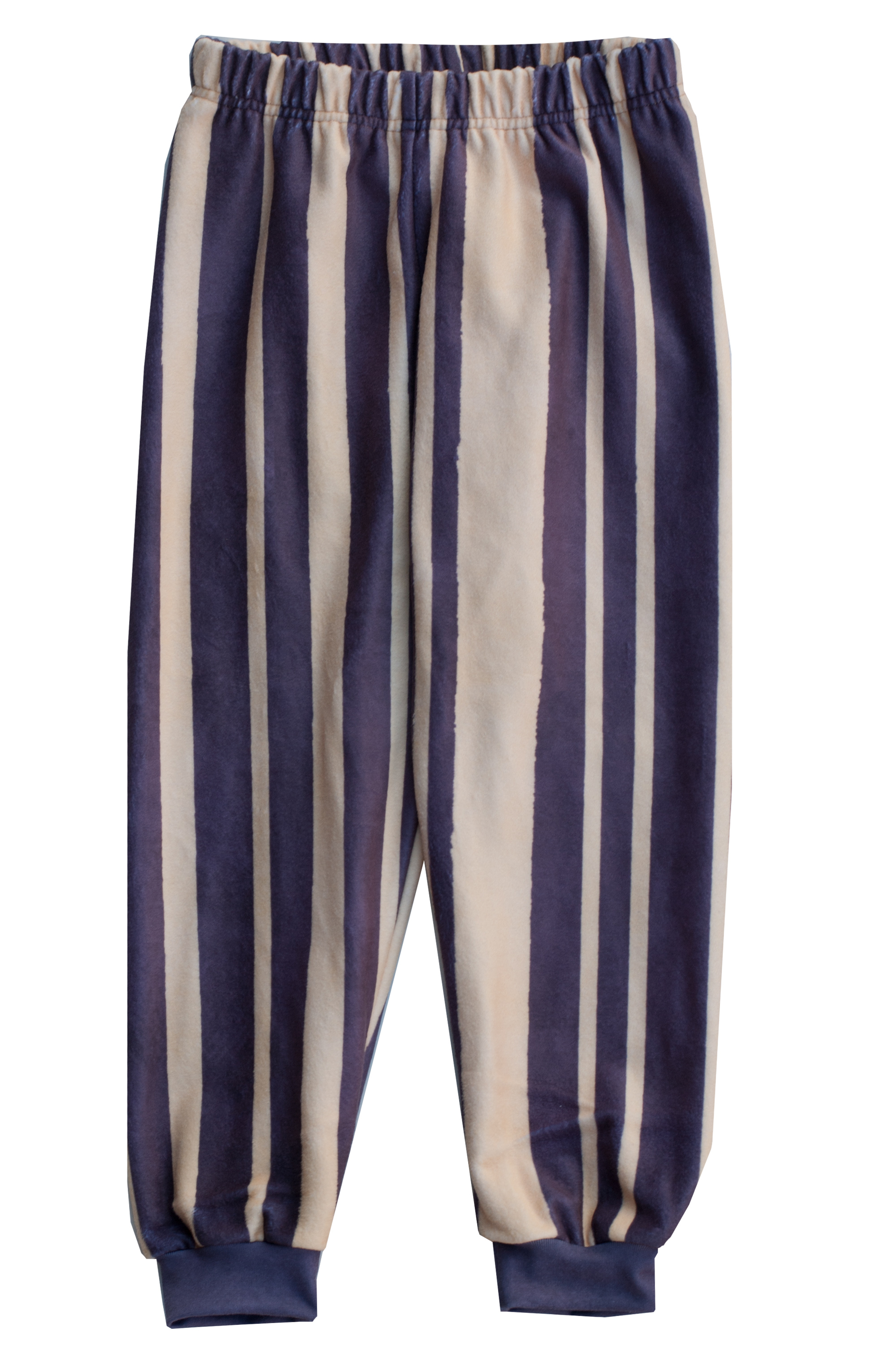 Cozy children's pants made of fleece with purple and yellow stripes