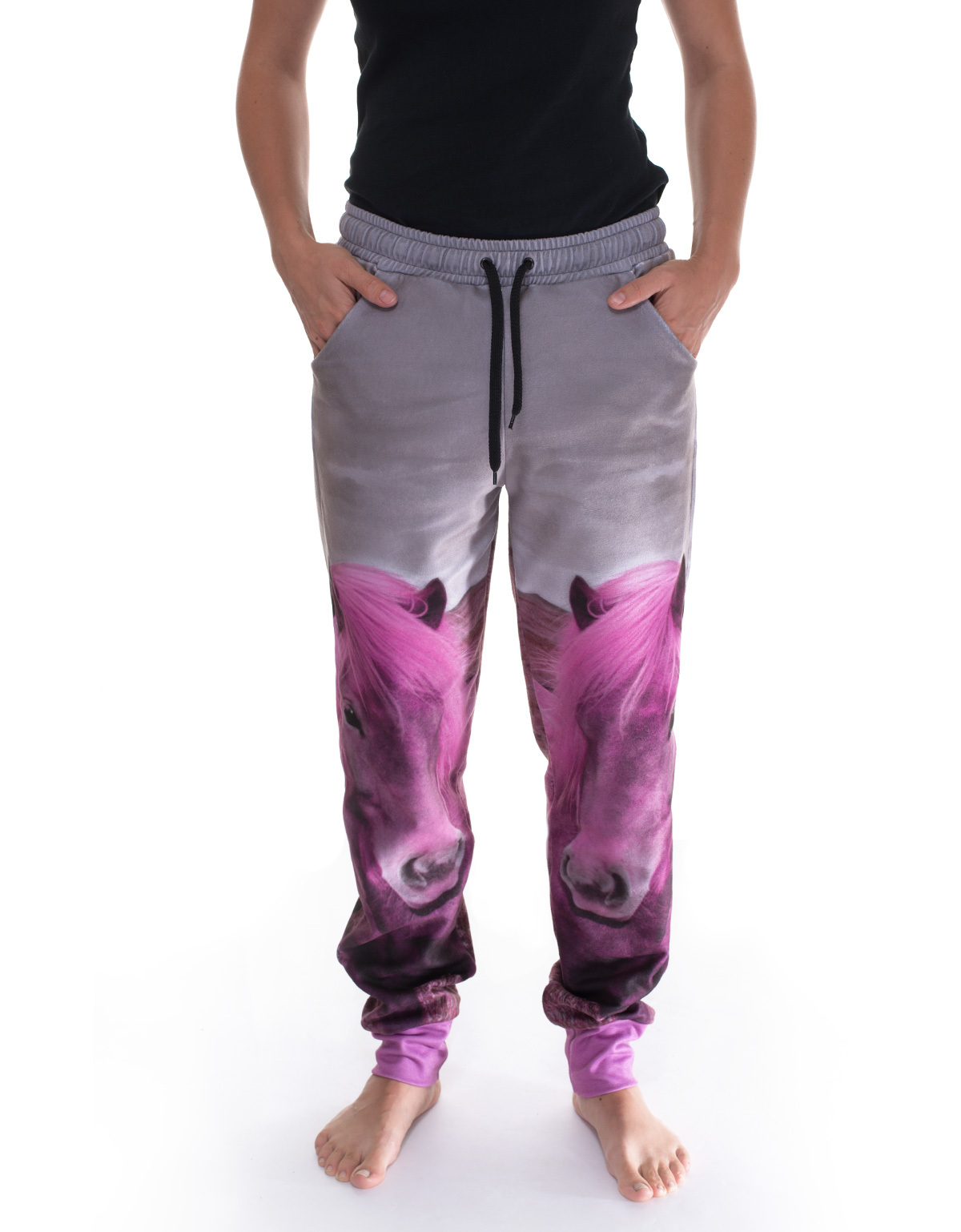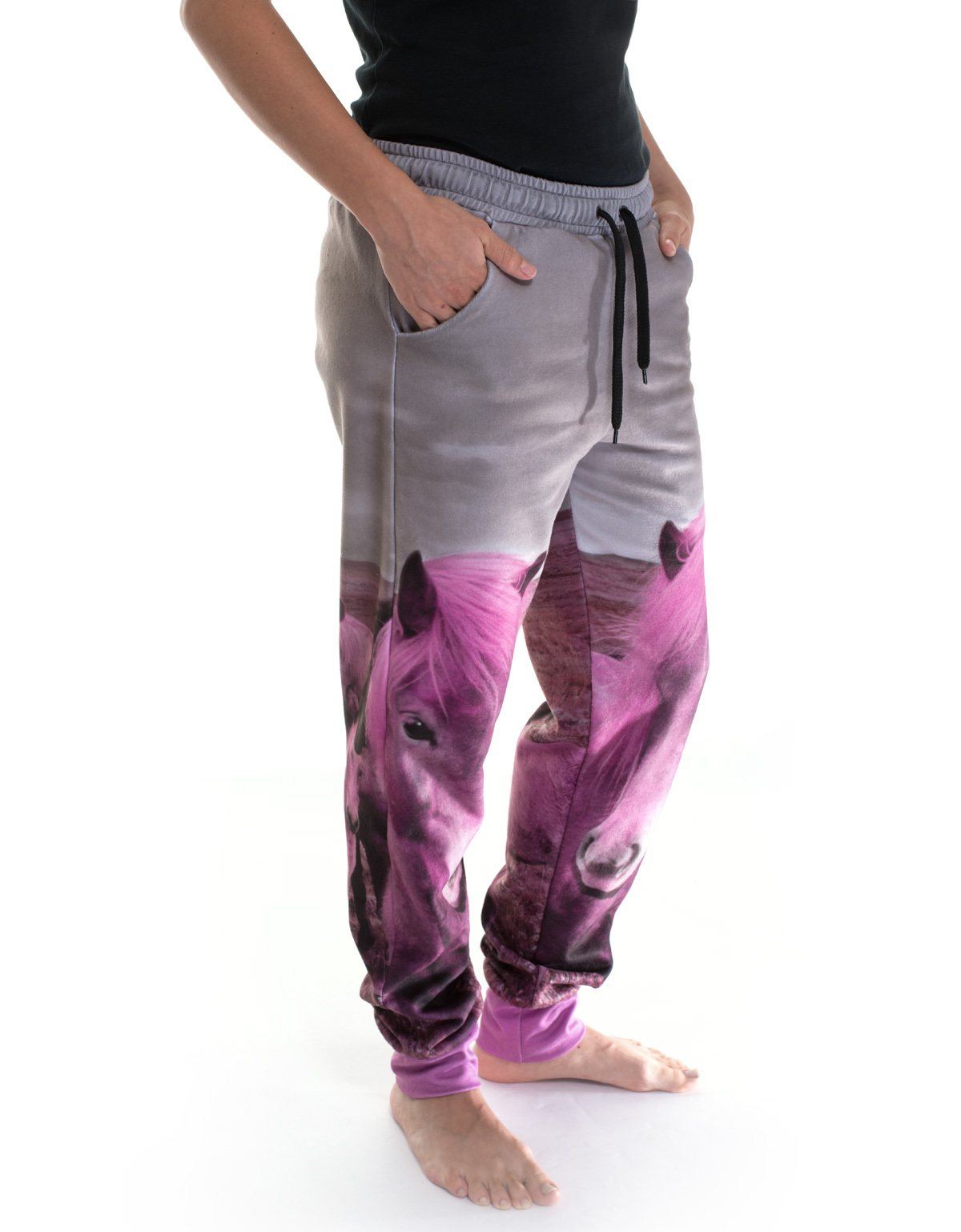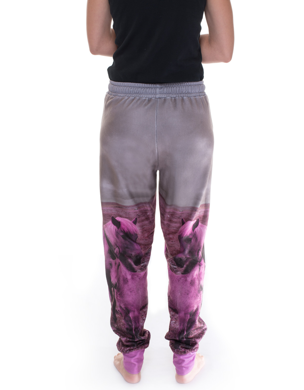 Cozy fleece jogging pants with Icelandic horse print in pink The PinkPony pants from RobeCode are the ideal choice for anyone looking for cozy, warm, and easy-care leisure pants. Made from soft fleece fabric, they impress with their comfortable fit, modern design, and functional features. What makes them special: the gray print with bright pink Icelandic horses makes these pants a real eye-catcher – stylish and comfortable at the same time. The elastic waistband, practical side pockets, and high pink leg cuffs ensure an optimal fit and freedom of movement. Whether as warm, comfortable pants at home, when camping, at festivals, as outdoor pants for the cabin after skiing, or for other leisure activities, the PinkPony pants are versatile and incredibly comfortable. They keep you warm, dry quickly, and are particularly easy to care for, making them your perfect companion for everyday life and adventure. PinkPony pants are also available for little explorers.